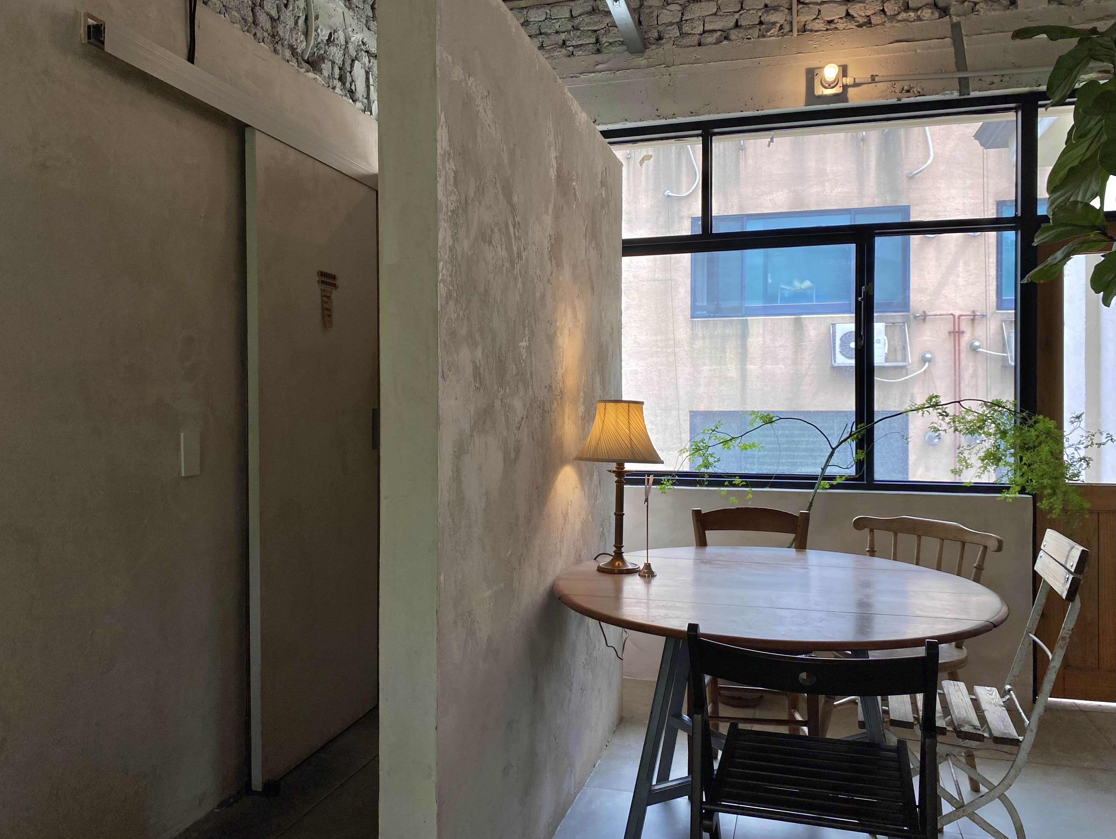 가벽 옆으로 중앙에 4인 테이블이 놓여있는 모습.