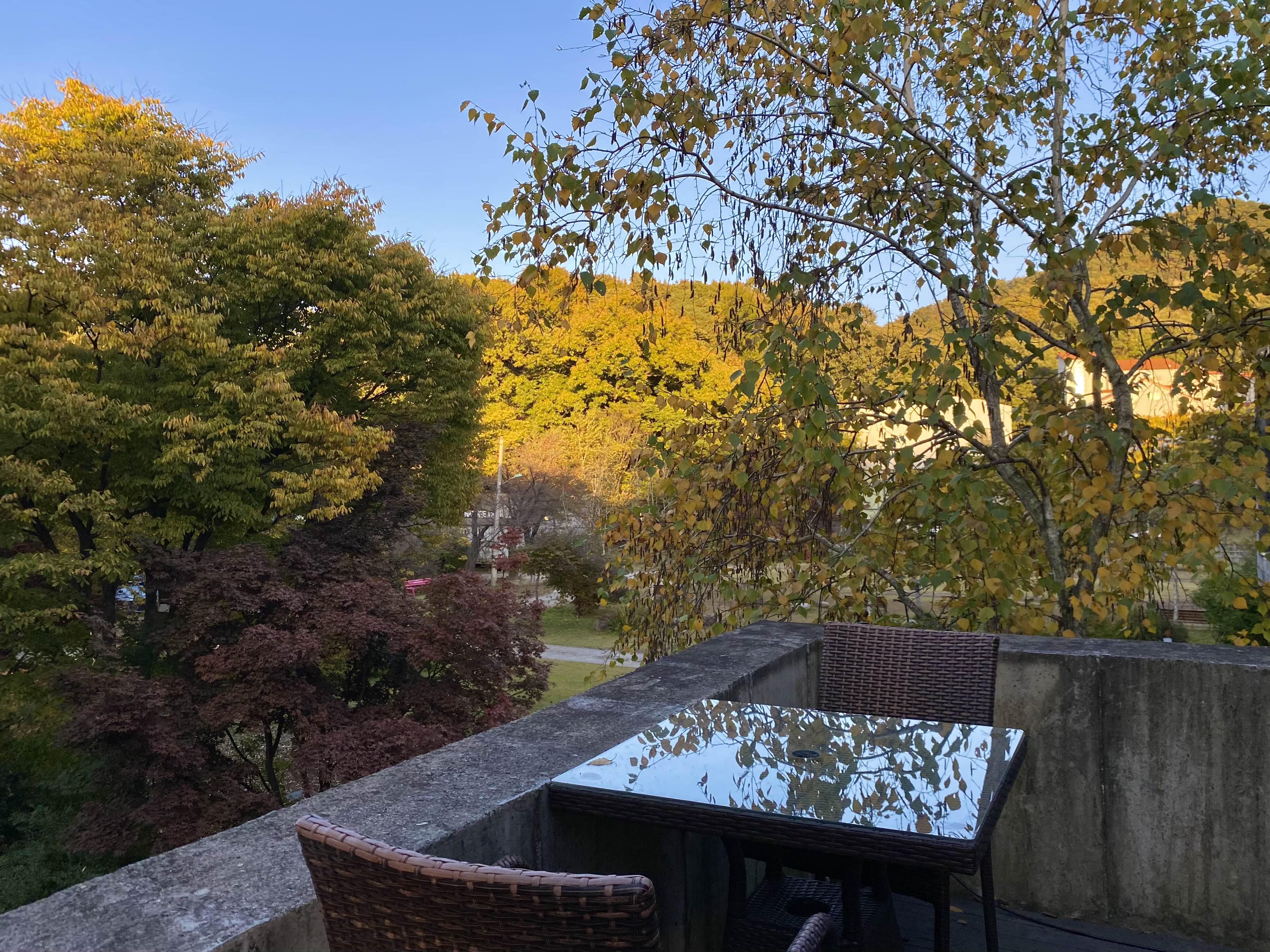 ㄷ자로 꺾인 곳에는 가을의 정취를 느낄 수 있는 단독 테이블도 있었다. (그런데 이 자리는 까치들이 넘 날라다녀서 앉기에는 조금 불편할 듯 했다..ㅎ)