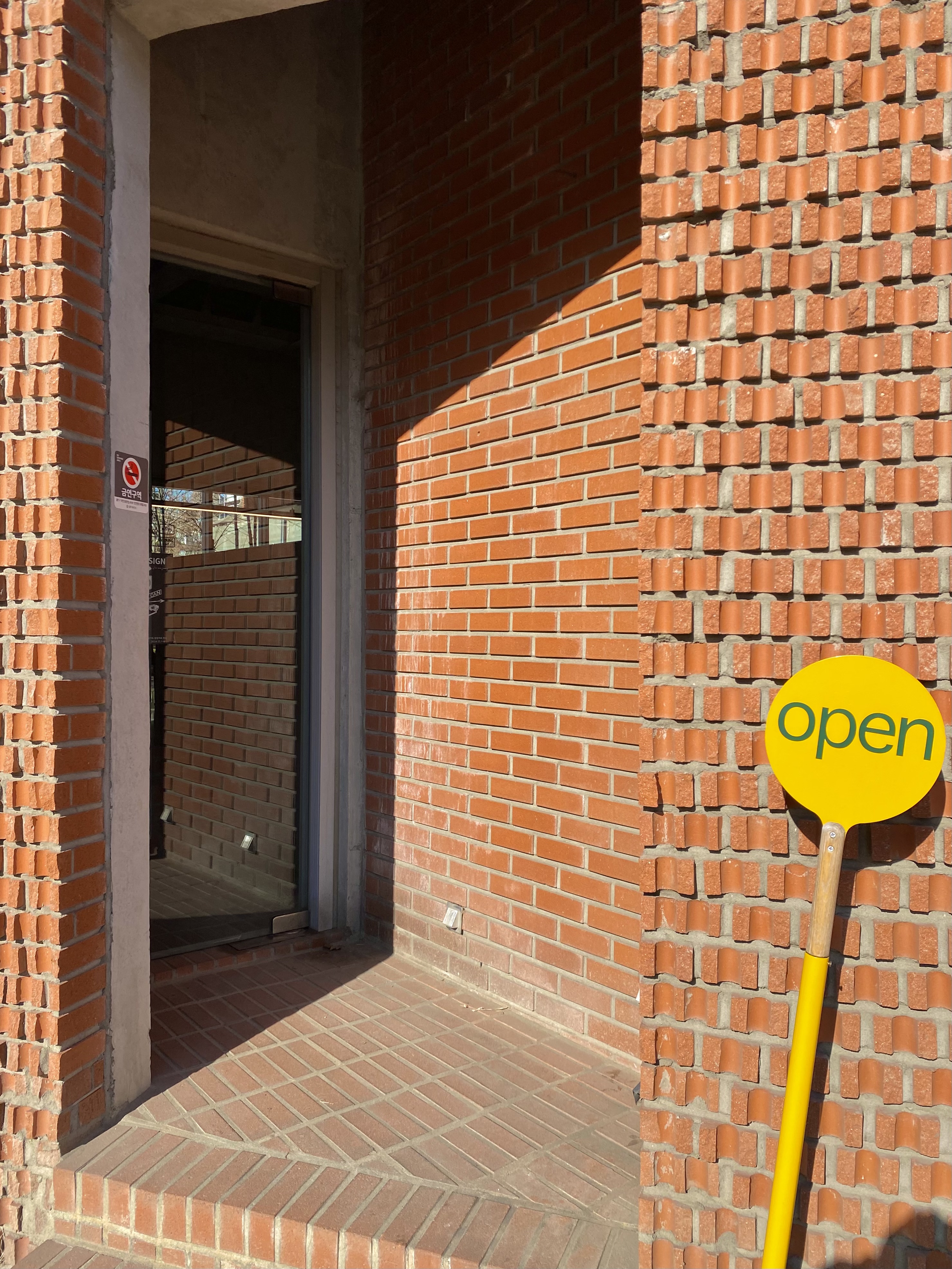 흰 커피잔 모양의 로고가 돋보이는 후문이다.