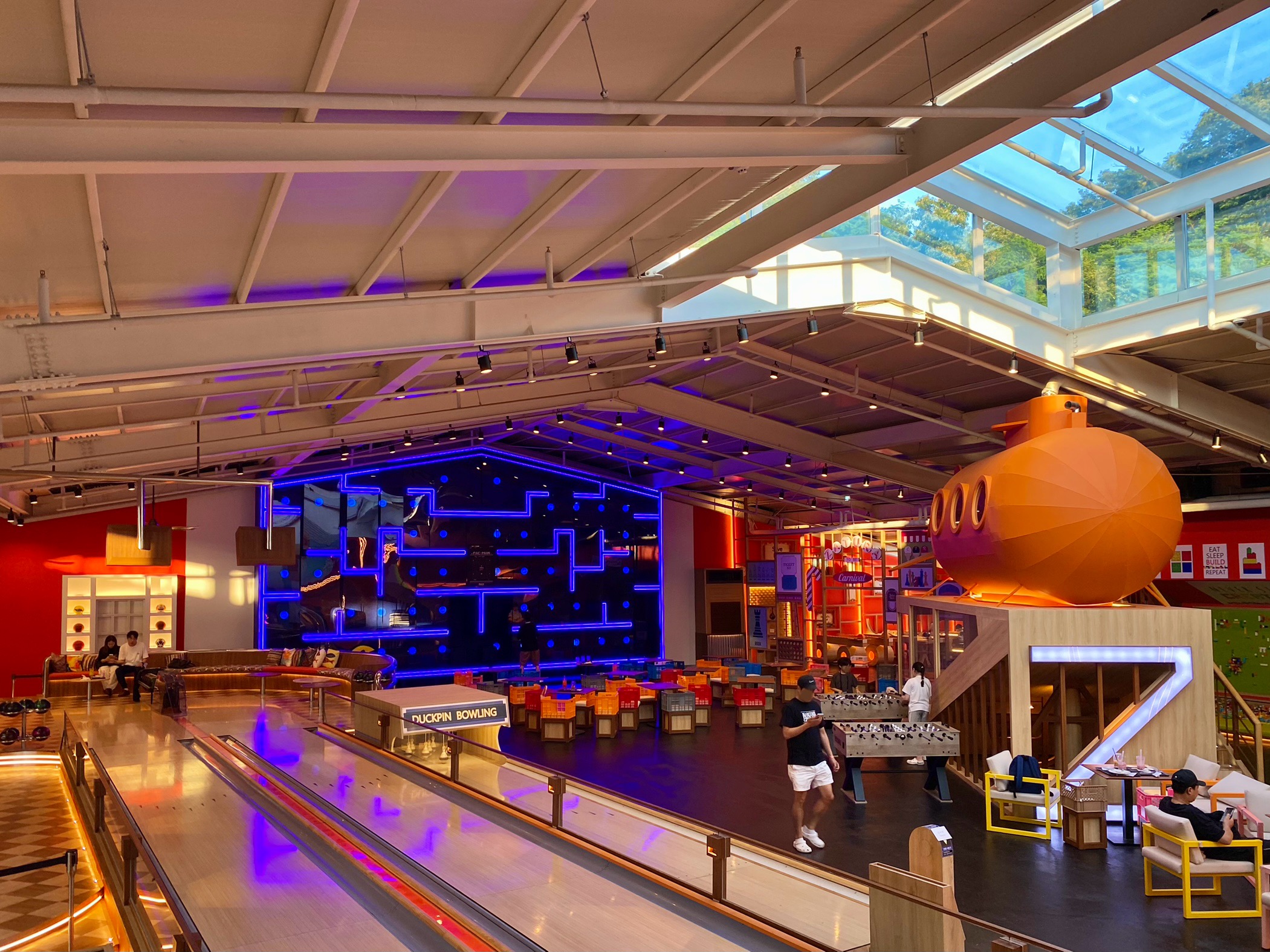 중앙에 있는 실내 볼링장은 2-3 레인 규모로,