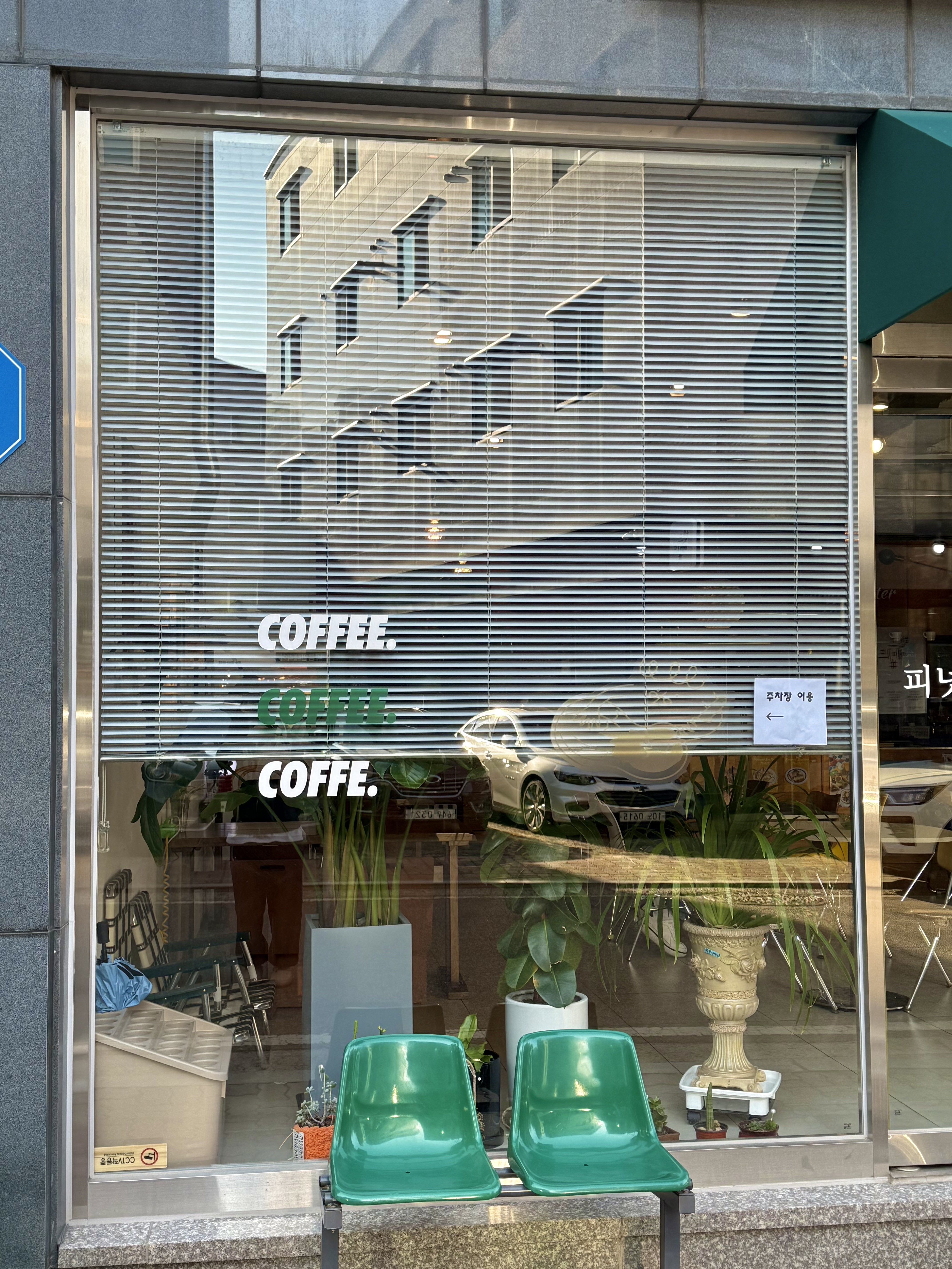 외관에서 눈에 띄는 초록색 어닝과 간판,