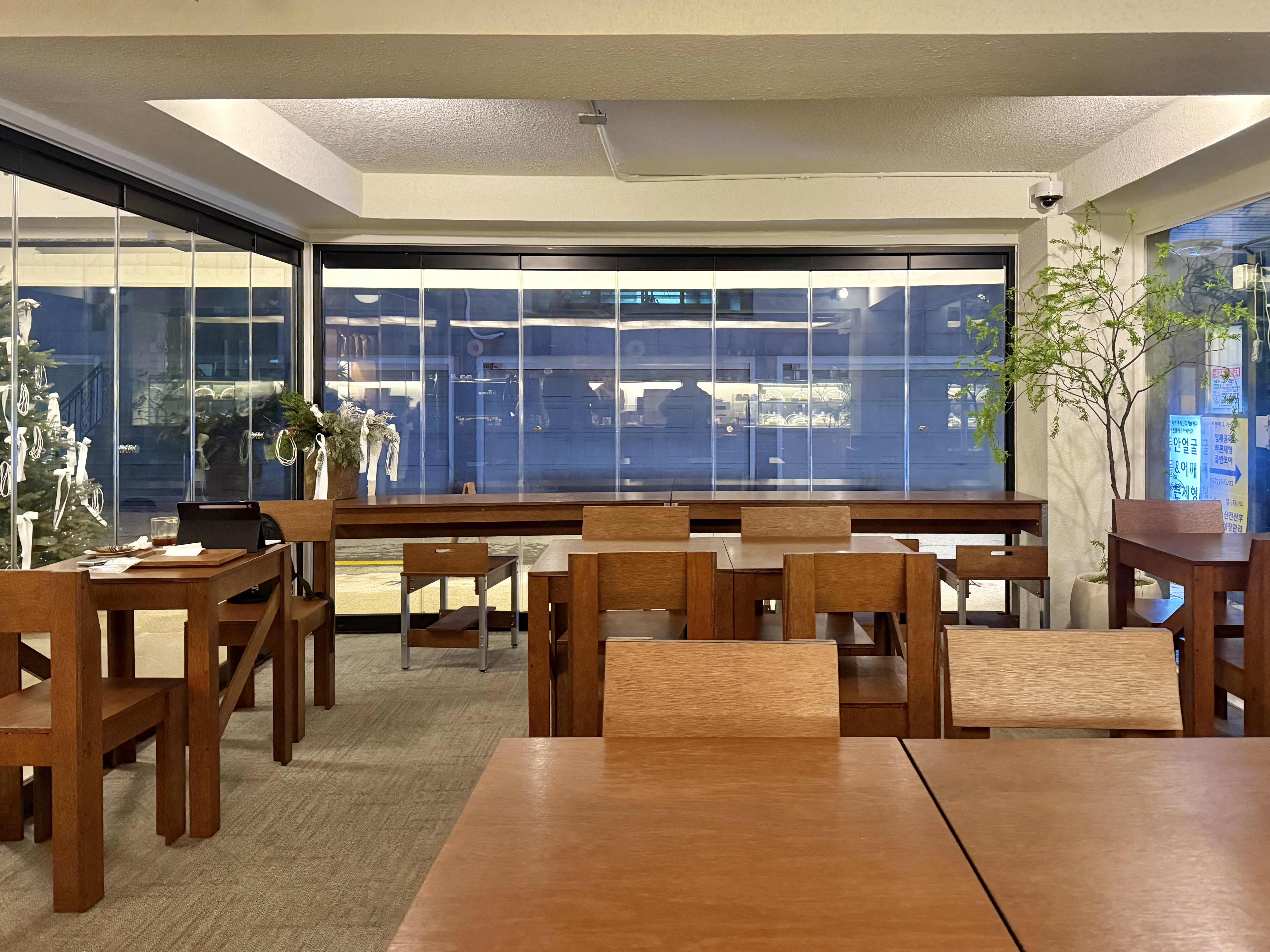 중앙 내부에는 2인과 4인 테이블들이 배치되어 있다.