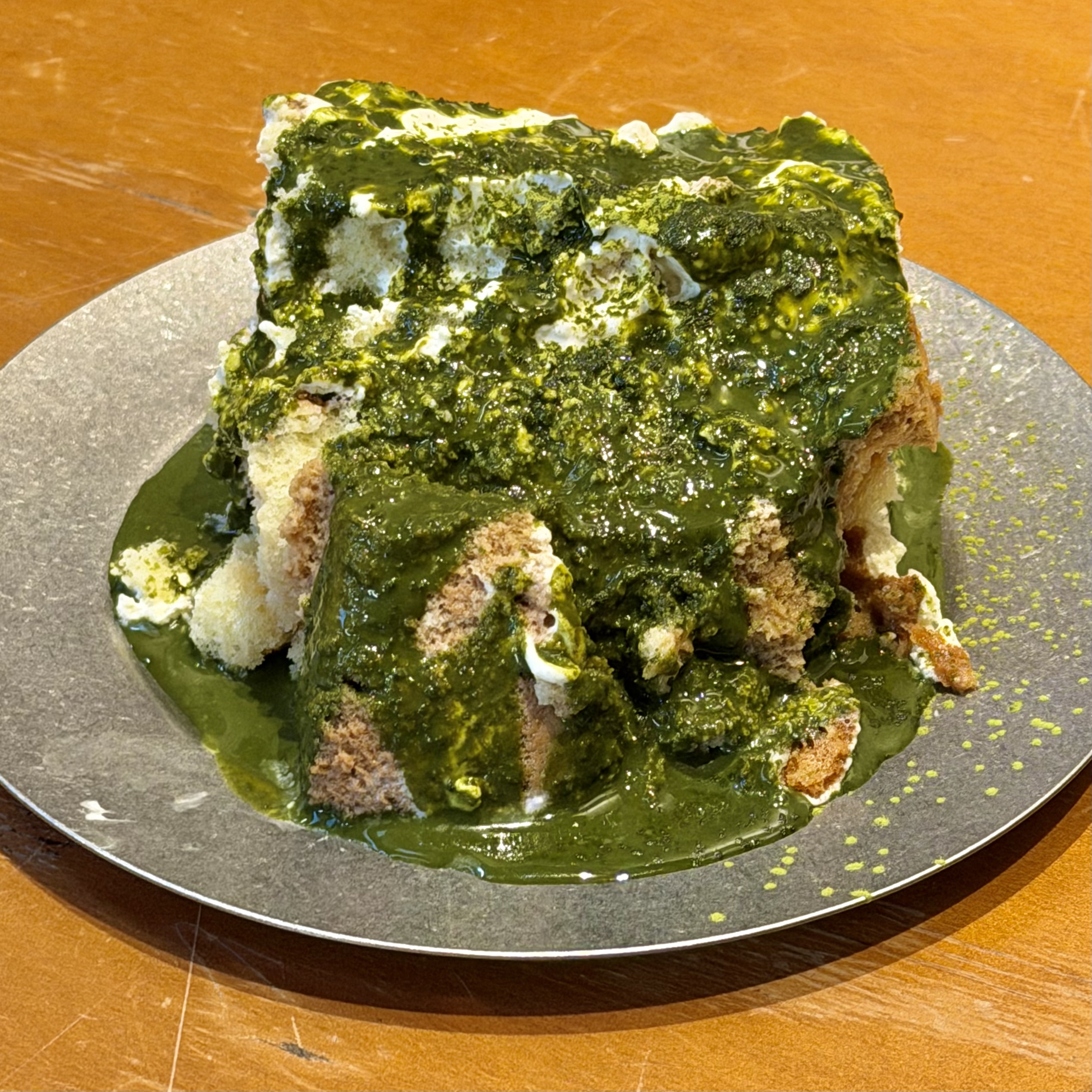 단단한 크림 위 잔뜩 뿌린 말차 소스