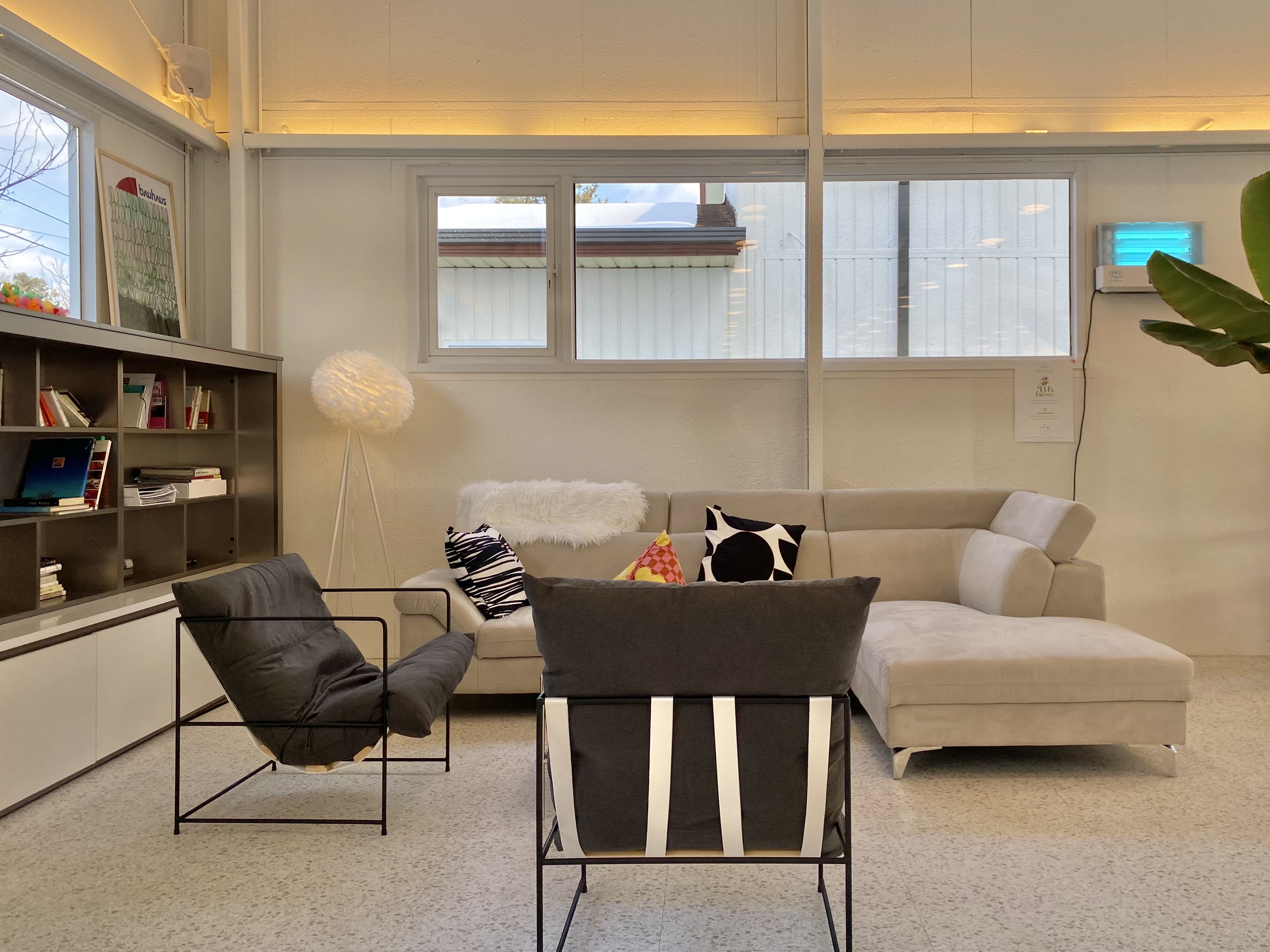붉은색 동그란 쇼파와 바깥 붉은 나무의 조화가 좋네~